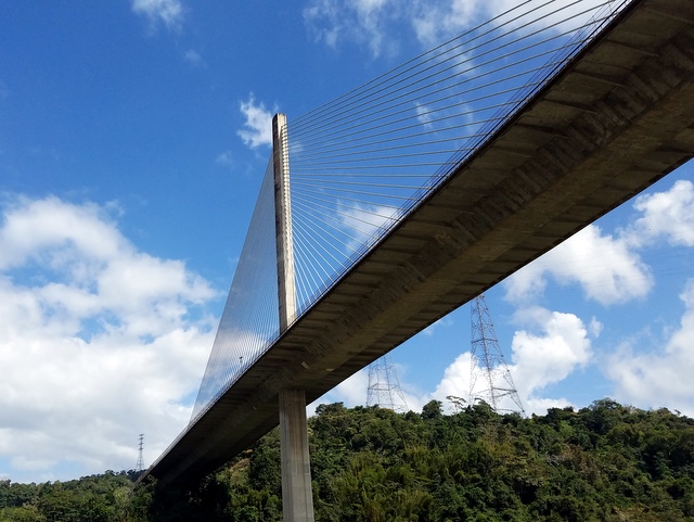 After passing under the unfinished bridge, we could look ahead and see our first locks. Prior to getting to the locks, we passed, on our starboard side, the original canal that was an attempt by the French to build a flat canal (a canal with no locks.) They gave up on it due mostly to unstable cuts in the taller land masses. There just was no way to do a flat canal here with the terrain being what it is. Hum, I am seeing a French theme here.