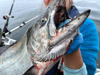 We caught our limit of Kings each day (6 total) and caught Coho (?), Rock Fish (8), and a Blue Shark. We saw whales, a dolphin, seals, sea lions, and a huge Basking Shark.